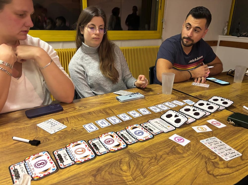 Stéphane nous a ensuite fait découvrir Splito. Le concept ? Coopérer avec ton voisin de gauche ET de droite pour des objectifs communs. Autant te dire que le suspense était là, à ne pas savoir de quel côté jouer ! 🎲