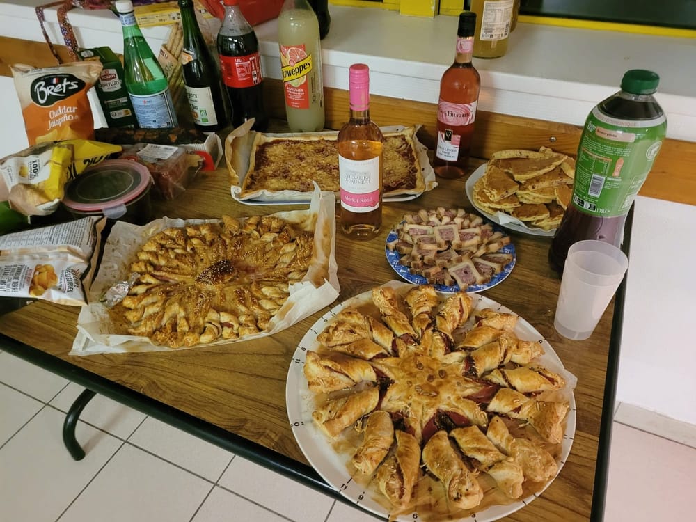 Sérieusement, tu aurais dû sentir ça. Chrystèle a débarqué avec une pizza sortant à peine du four, et l'odeur a envahi toute la salle 🍕. Coralie et Maïté avaient préparé des feuilletés en forme de soleil magnifiques (et délicieux !), pendant que Ndzai nous régalait avec des nems faits maison. Un pur délice ! Gâteaux, bonbons... on n'a manqué de rien.