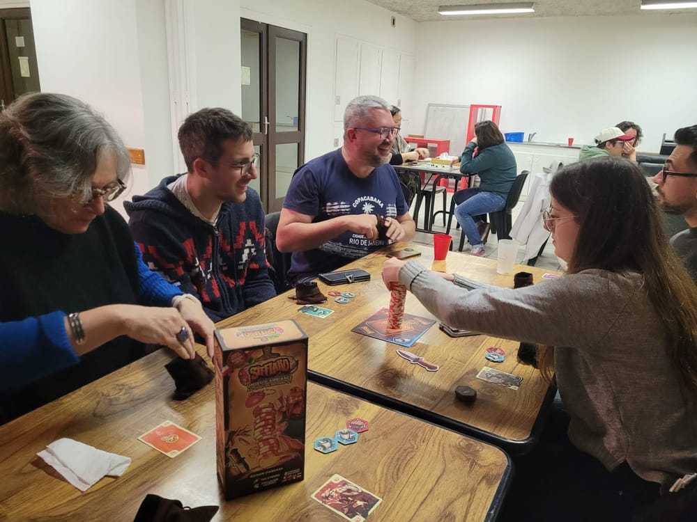 L'estomac bien rempli, les choses sérieuses ont pu commencer. Enfin, "sérieuses"... Coralie a dégainé Sifflard, un jeu où tu dois piquer les meilleures tranches de saucisson sans te faire pincer par le tavernier. On s'est bien demandé comment Louis a fait pour amasser autant de tranches, même s'il s'est fait prendre la main dans le sac au moins une fois ! Les éclats de rire fusaient de partout. 😂