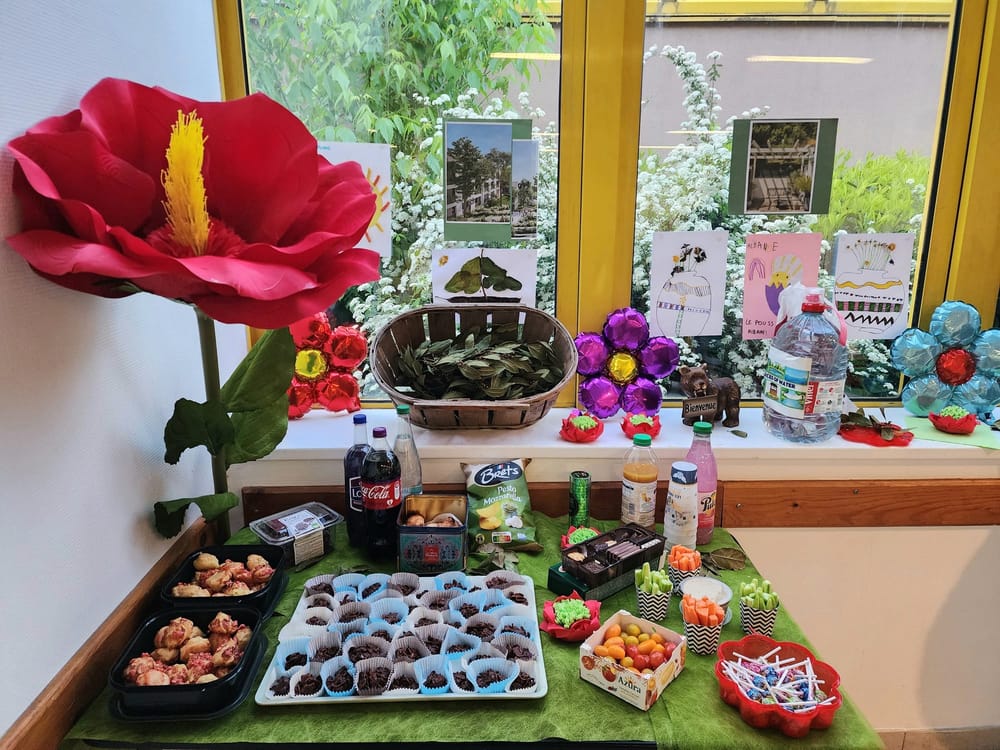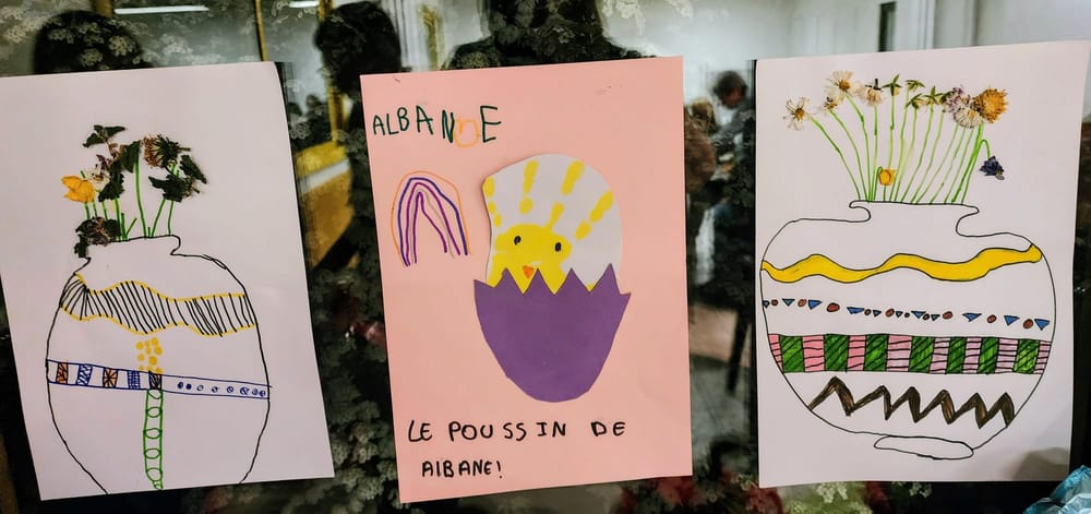 On a vu passer des poules grâce à Nicole et des fleurs en papier d’une délicatesse rare réalisées par Dominique. L'ambiance était chargée en chlorophylle 🌿 et en lilas, transformant notre salle habituelle en une sorte de serre tropicale sans l'humidité désagréable.